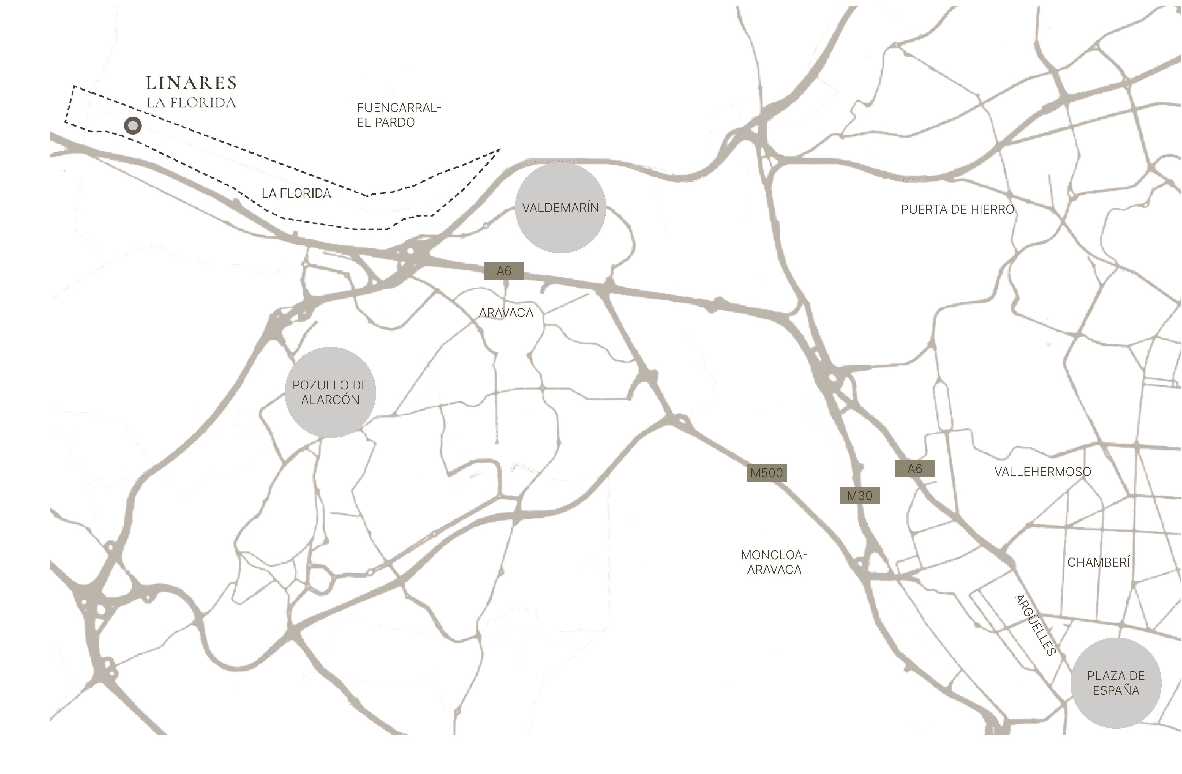 La ubicación de Linares permite mantener una conexión fluida con el centro de Madrid, al mismo tiempo que garantiza una clara separación de su intensidad.